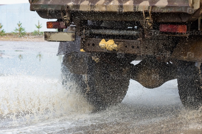 Автомобильная дождевая лужа брызгает водой