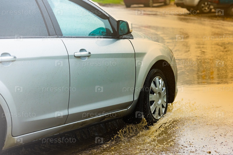 Автомобильная дождевая лужа брызгает водой