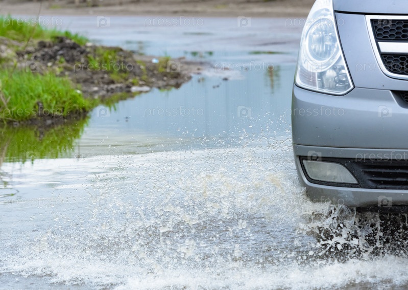 Автомобильная дождевая лужа брызгает водой