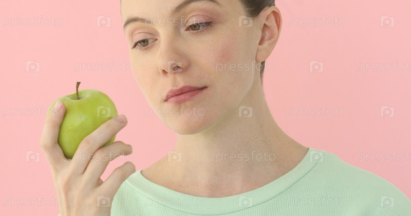 Красивая девушка смотрит на яблоко