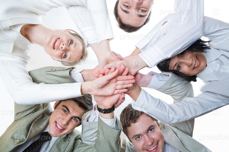 Ниже снимок улыбающихся коллег, которые делают кучу рук и смотрят на камеру