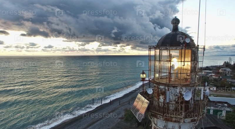 Аэрофотосъемка старого маяка на берегу моря в Сухуми