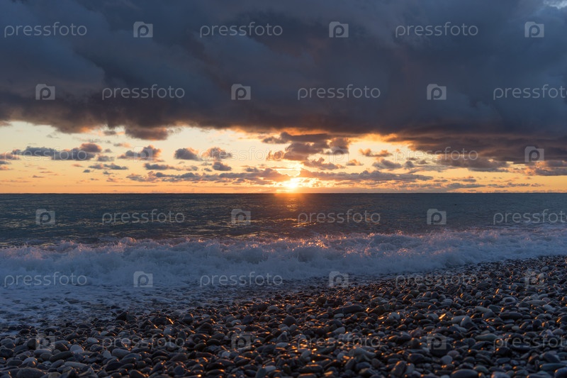 Драматические небо над темным морем и узкая полоса заката с игристым солнцем