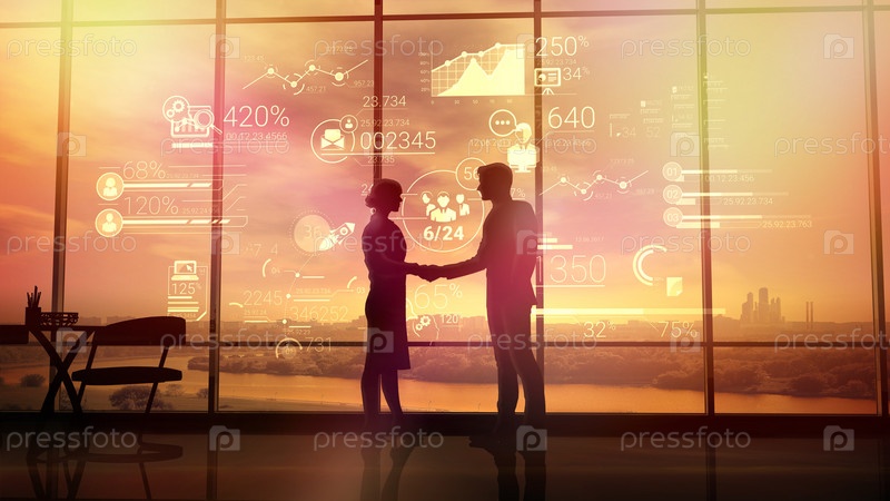 Бизнес-партнеры пожимают друг другу руки на фоне корпоративной инфографики
