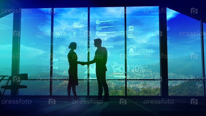 Бизнес-партнеры пожимают друг другу руки на фоне корпоративной инфографики