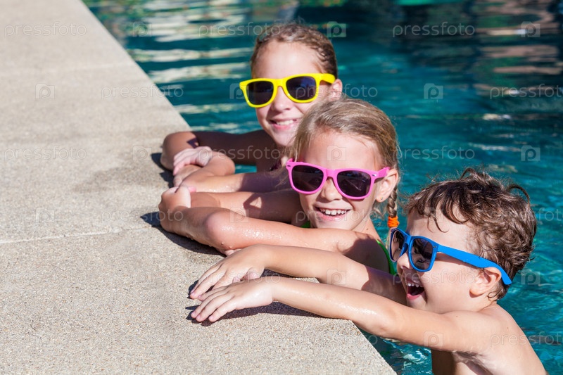 Счастливые дети, играющие на бассейне в дневное время