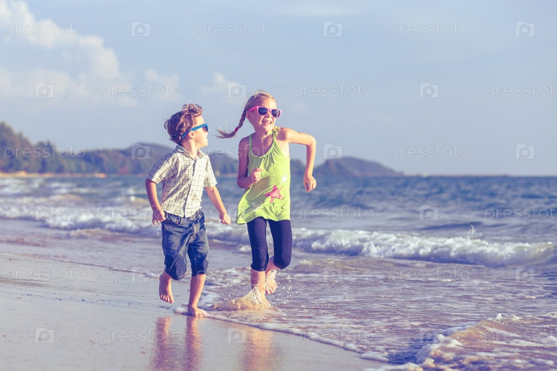 Счастливые дети, играющие на пляже в дневное время