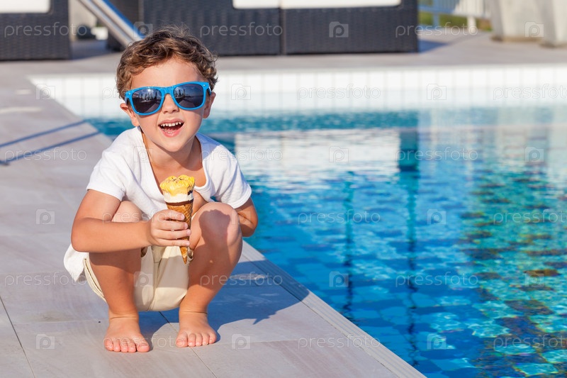 Счастливый маленький мальчик с мороженым, сидя рядом с бассейном