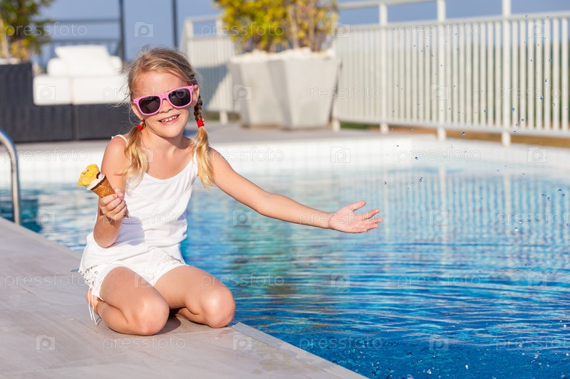 Счастливая маленькая девочка с мороженым, сидя рядом с бассейном