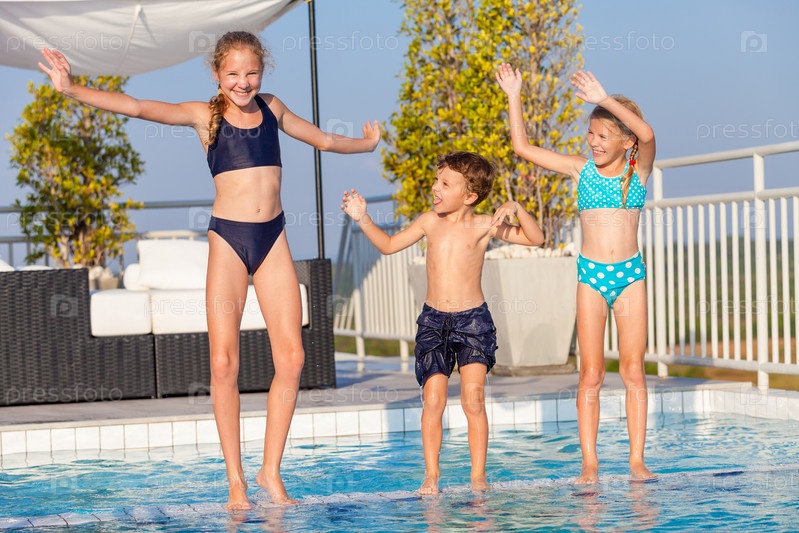 Счастливые дети, играющие в бассейне в дневное время