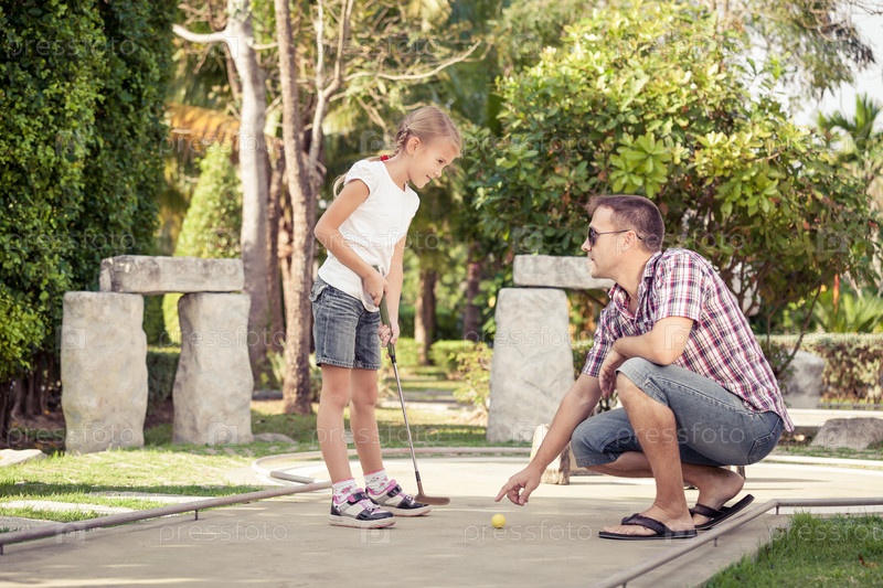 Отец учит свою дочь играть в мини-гольф