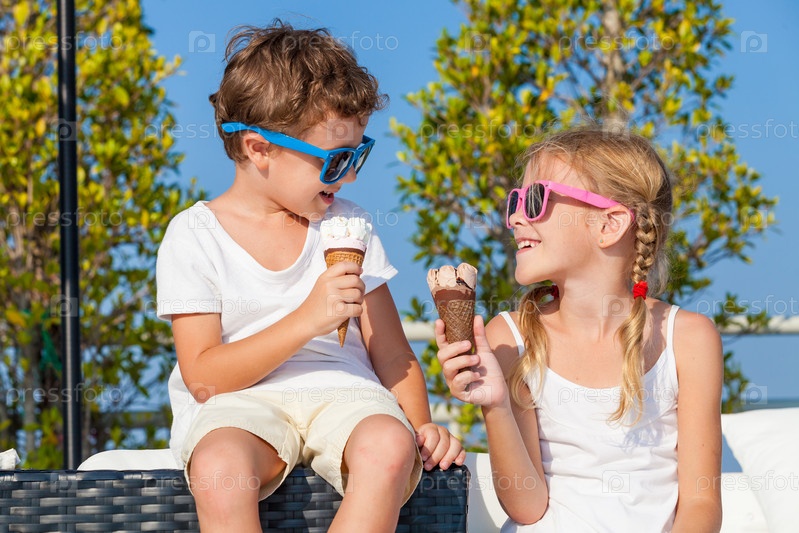 Дети едят мороженое возле бассейна в дневное время