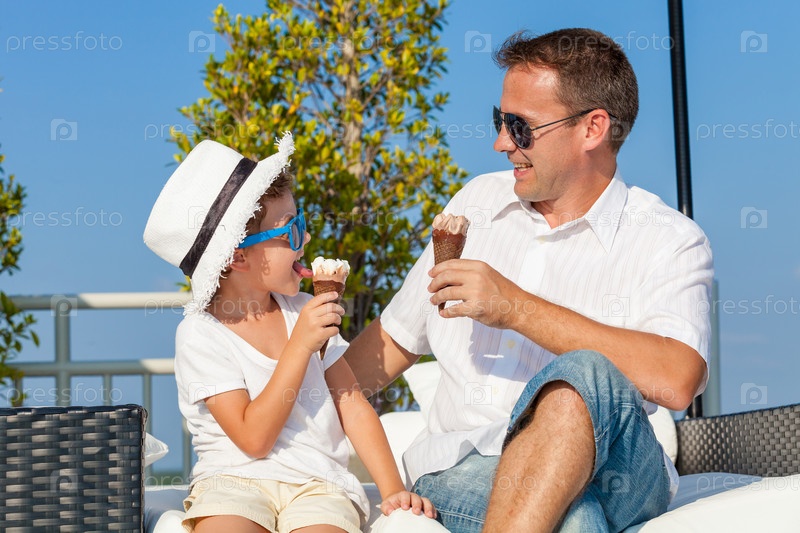 Отец и сын отдыхают рядом с бассейном в дневное время