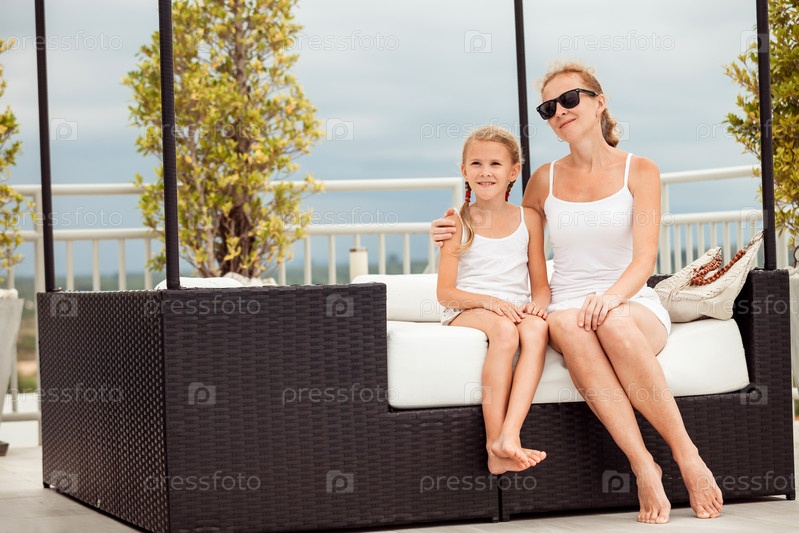 Мать и дочь рядом с бассейном в дневное время
