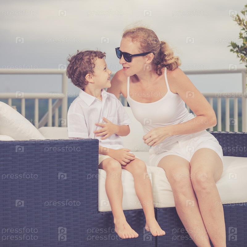 Мать и сын отдыхают рядом с бассейном в дневное время