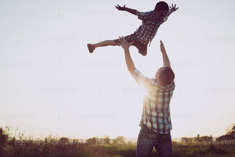 Отец и сын играют в парке во время заката