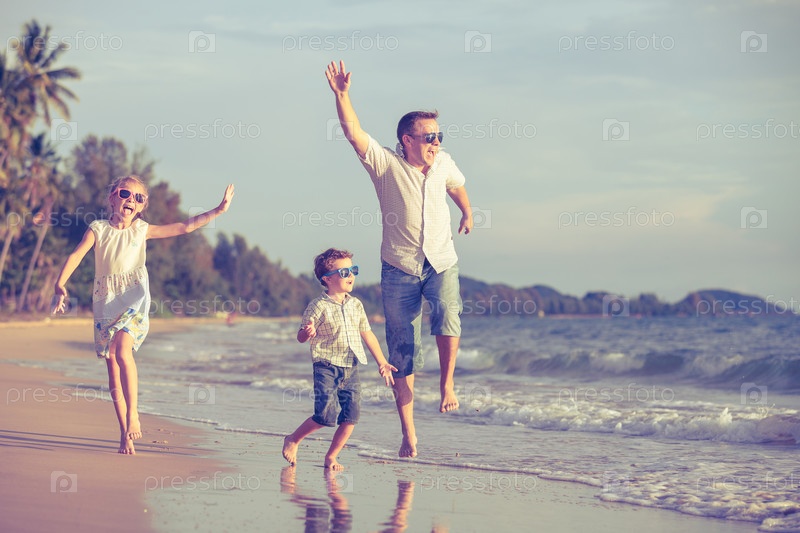 Отец и дети, играющие на берегу озера
