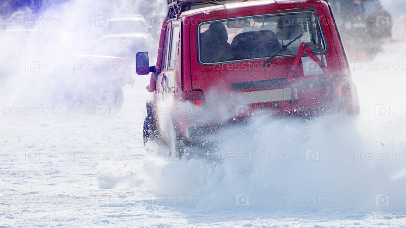Автомобиль едет на заснеженной дороге