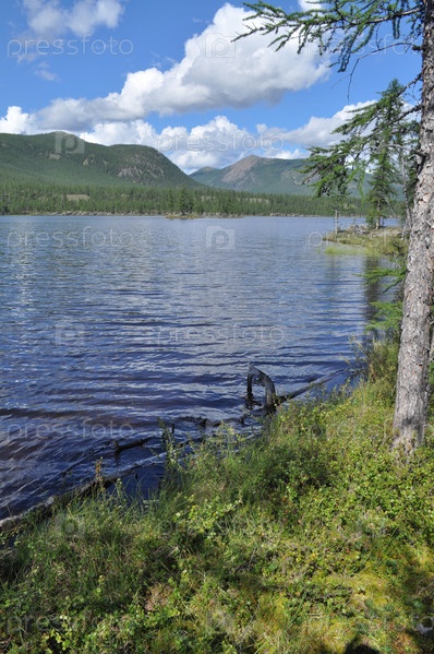 Пейзаж с озером и горами вдоль берега