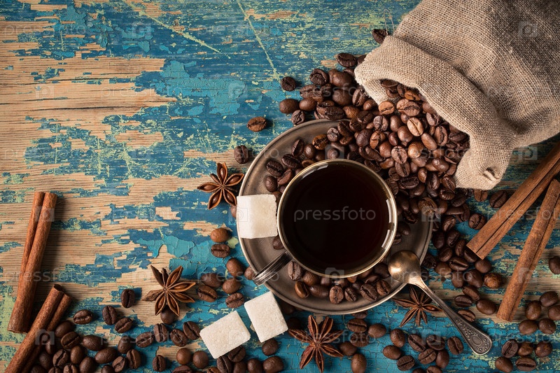 Чашка кофе с зернами, корицей и сахаром