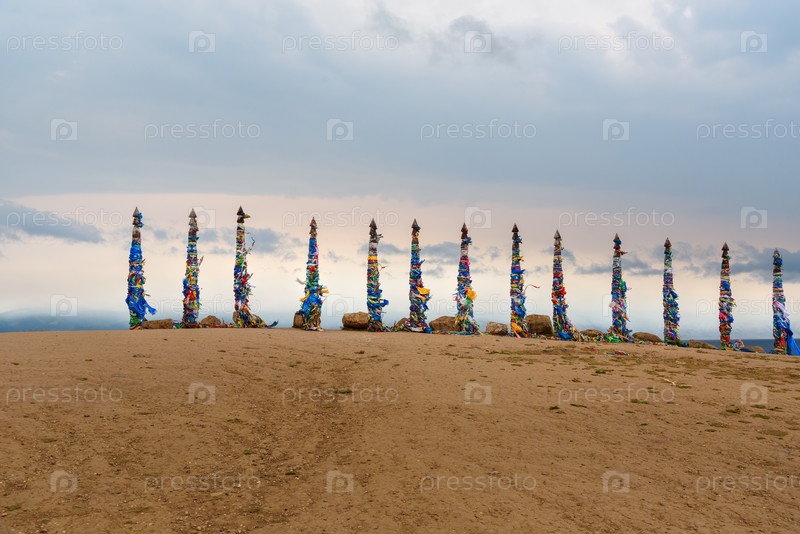 Деревянные ритуальные столбы с красочными лентами Хадак на мысе Бурхан. Озеро Байкал. Остров Ольхон. Россия