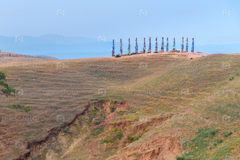Деревянные ритуальные столбы с красочными лентами Хадак на мысе Бурхан. Озеро Байкал. Остров Ольхон. Россия