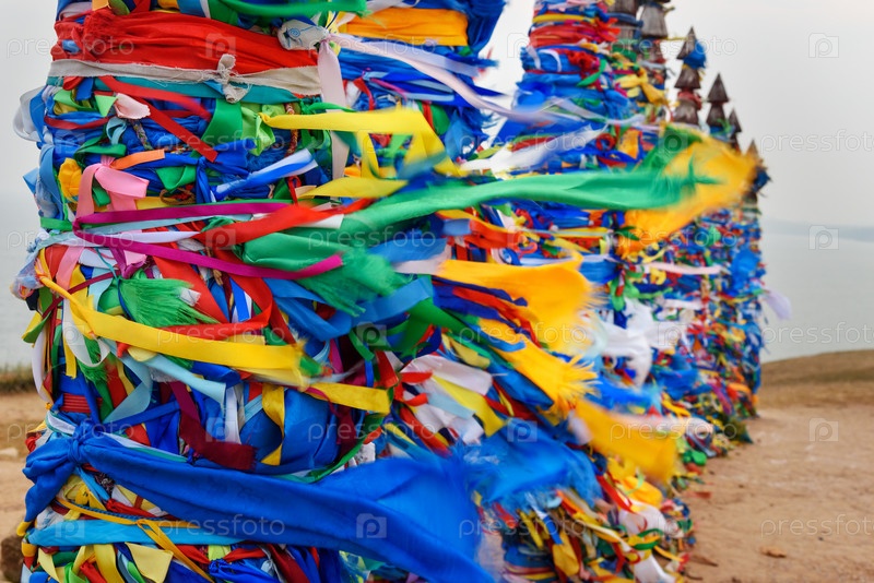 Деревянные ритуальные столбы с красочными лентами Хадак на ветру на мысе Бурхан. Озеро Байкал. Остров Ольхон. Россия