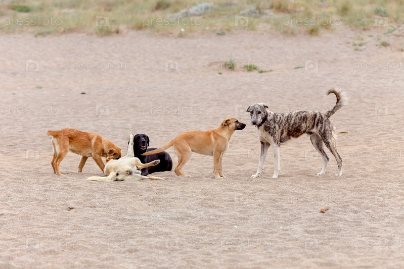Четыре собаки играют на песке