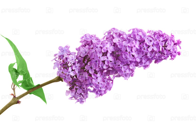 Ветви фиолетовой сирени на белом фоне с листьями