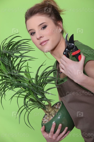 Молодая женщина ухаживает за растением
