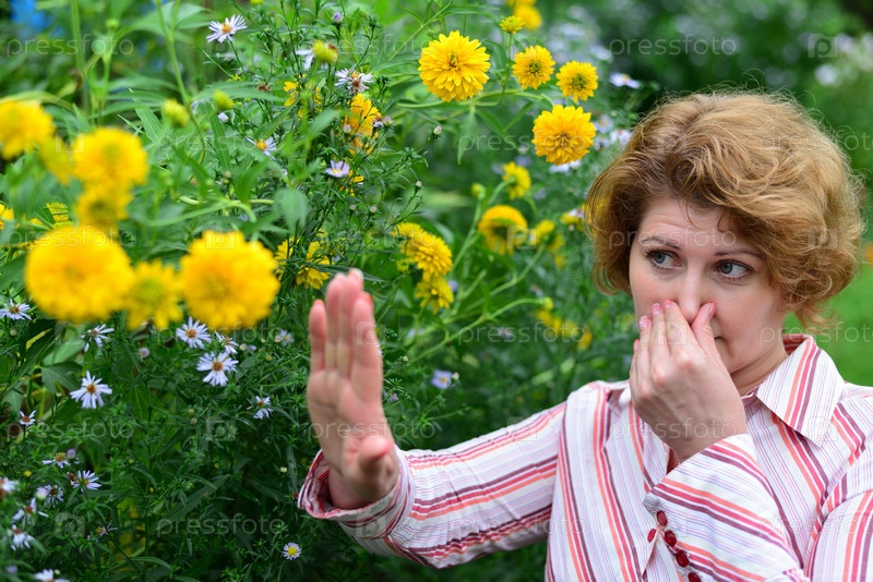 Женщина с ринитом рядом с желтыми цветами