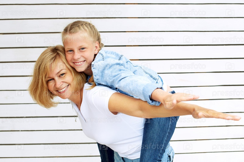 Счастливая мать и дочь, смеясь вместе на открытом воздухе