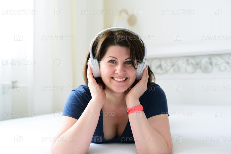 Женщина слушает музыку в наушниках на кровати