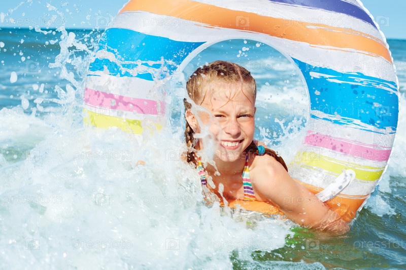 Счастливый ребенок играет в голубой воде океана на тропическом курорте