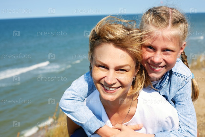 Счастливая мать и дочь на море