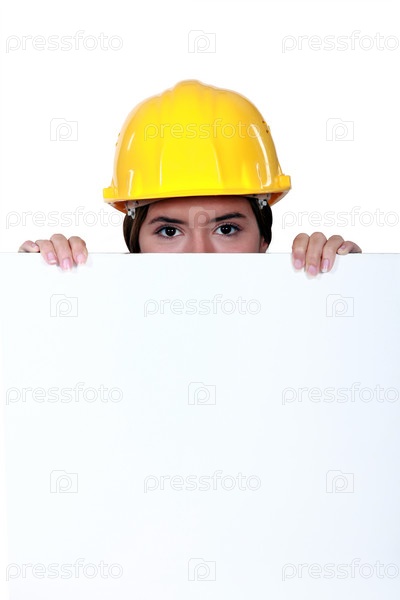 Женщина-строитель прячется за щит