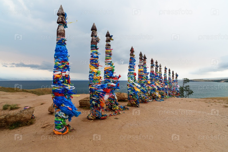 Деревянные ритуальные столбы с красочными лентами Хадак на мысе Бурхан. Озеро Байкал. Остров Ольхон. Россия