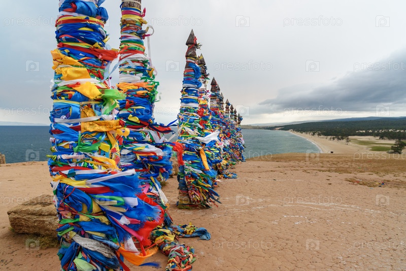 Деревянные ритуальные столбы с красочными лентами Хадак на мысе Бурхан. Озеро Байкал. Остров Ольхон. Россия