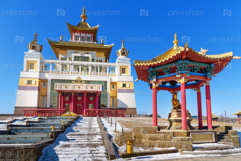 Буддийский комплекс Золотая обитель Будды Шакьямуни весной. Элиста. Россия