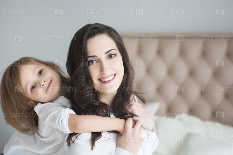 Молодая женщина утром обнимается с маленькой дочерью.Концепция любви и семьи