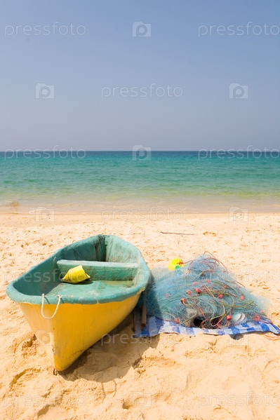 Лодка и рыболовные сети на фоне моря и безоблачное небо