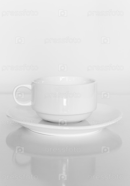 Белая чашка кофе на белой тарелке на белом фоне