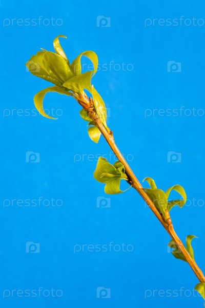 Ветка дерева с молодыми листьями на синем фоне