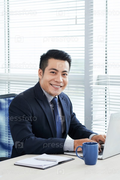 Улыбаясь, бизнесмен позирует для фотографии