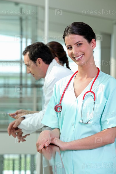 Улыбающаяся медсестра с коллегами