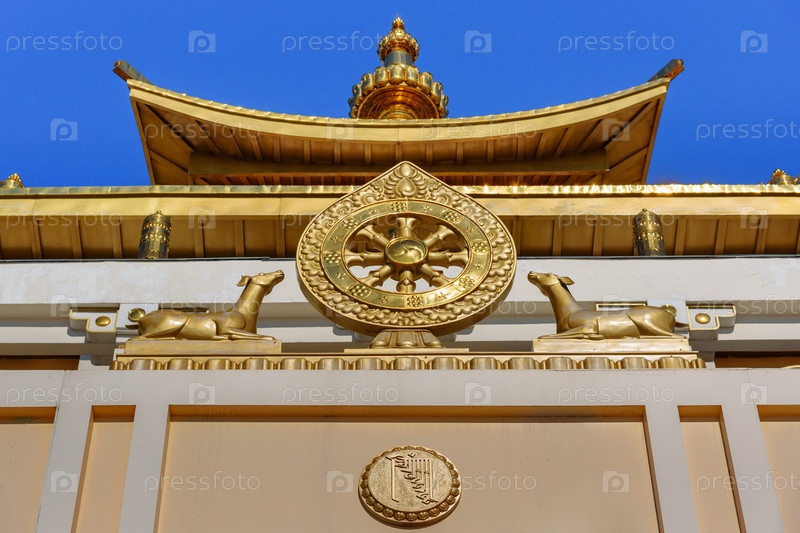 Элемент храма в буддийском комплексе Золотой обители Будды Шакьямуни весной. Элиста. Россия