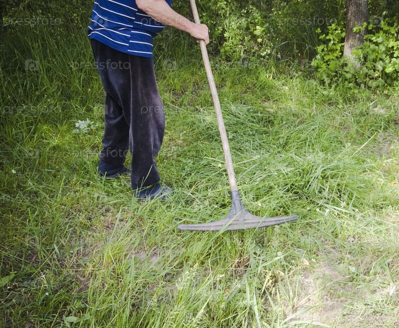 Фермер собирает граблями траву