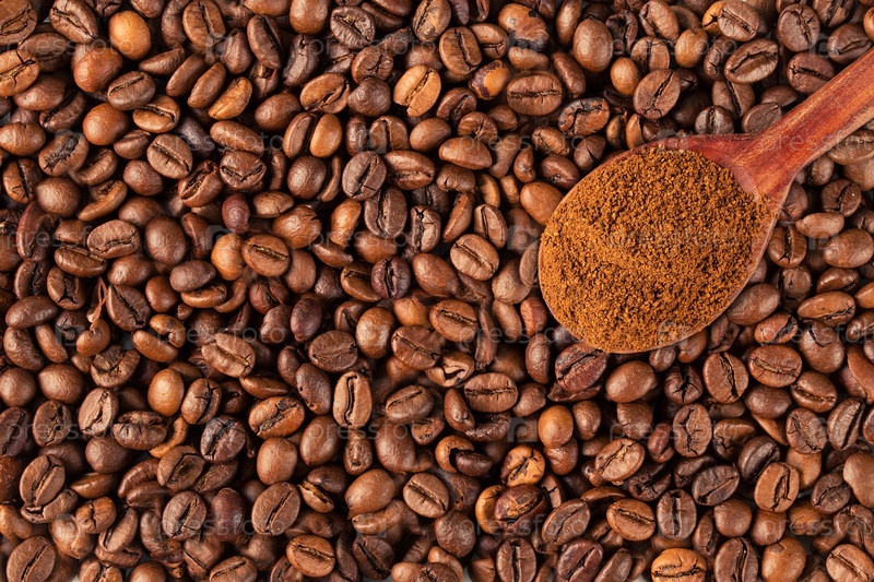 Молотый кофе в винтажной ложке на кофе в зернах