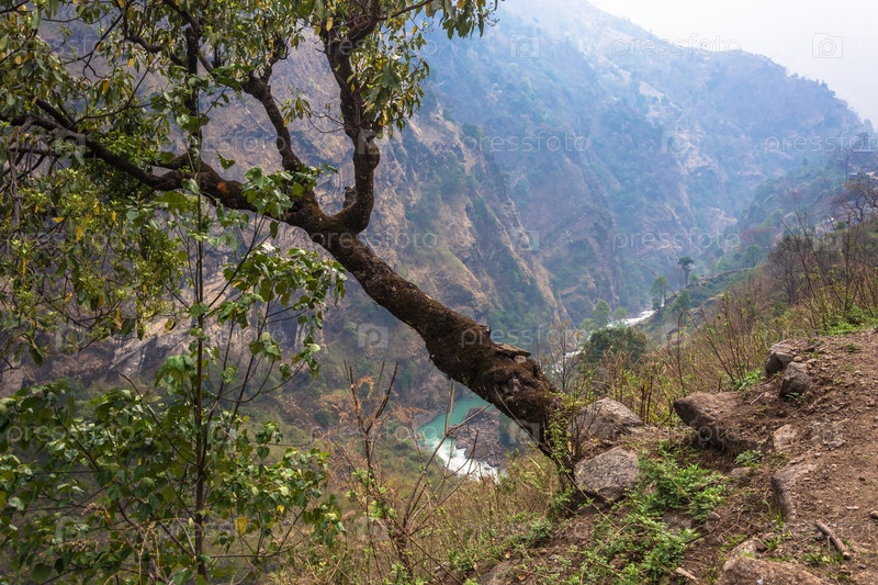 Горный пейзаж с деревьями на переднем плане