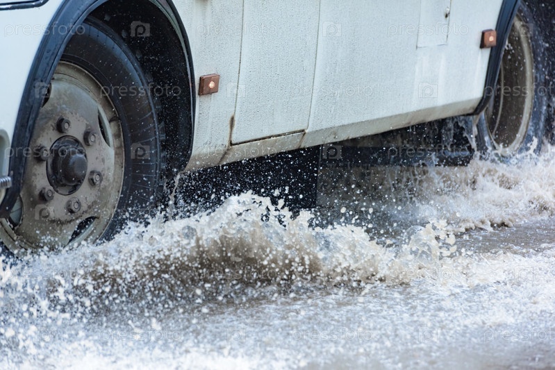 Автомобильная дождевая лужа брызгает водой